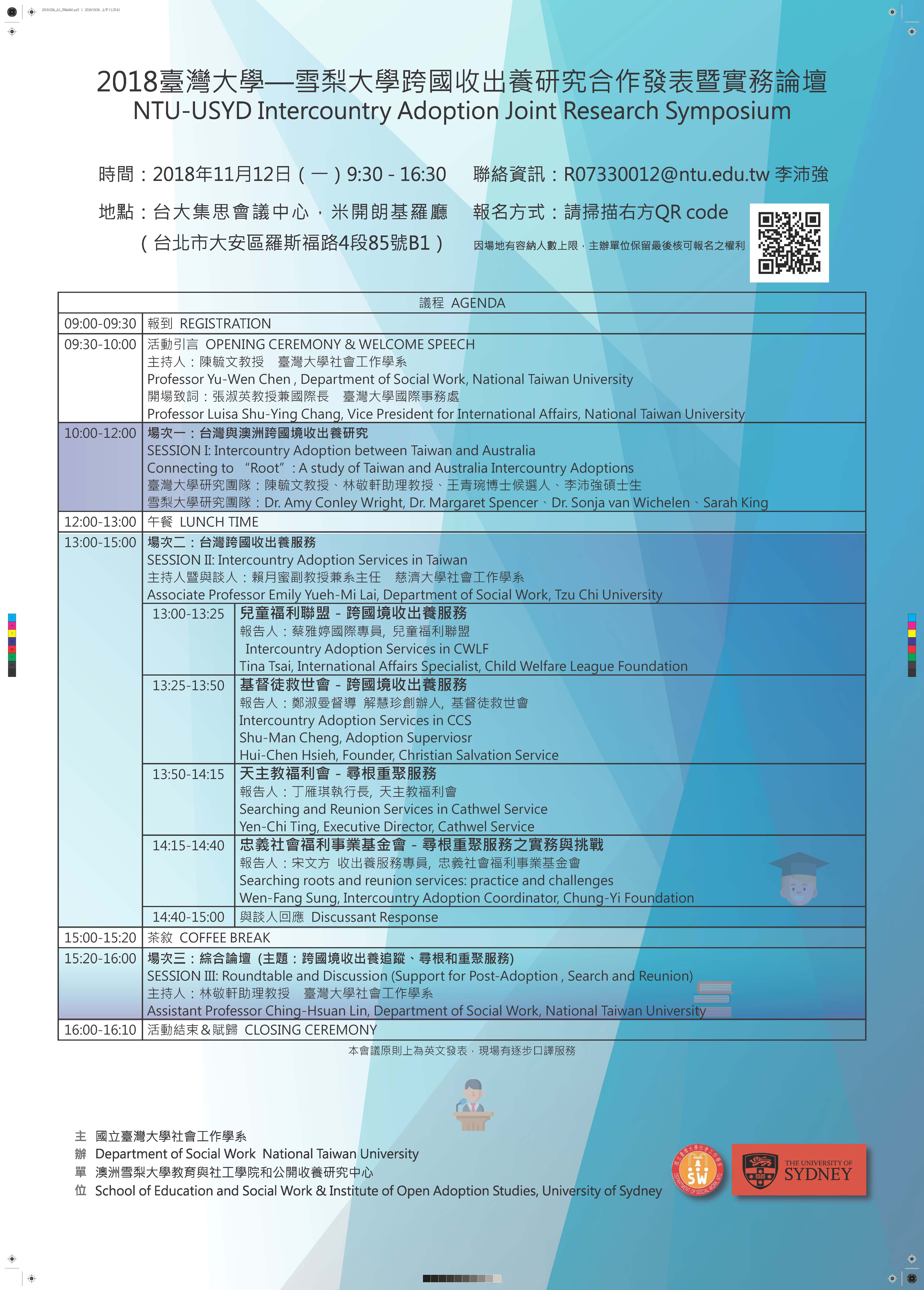 2018 臺灣大學X雪梨大學【跨國收出養研究成果發表暨實務論壇】 |