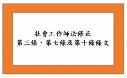 依據107年12月28日衛部救字第1070141105號函轉總統府秘書長107年12月19日華總一義字第10700137560號函發布,有關立法院咨請總統公布修正社會工作師第三條、第七條及第十條...