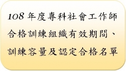 公告108年度專科社會工作師合格訓練組織有效期間、訓練容量及認定合格名單。 參考連結: 衛生福利部社會救助及社工司 https://dep.mohw.gov.tw/DOSAASW/cp-546-4780...