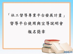 「社工督導專業平台發展計畫」 督導平台使用與宣導說明會-報名簡章 一、計畫緣起 社會工作督導作為間接「使能」過程,在很大程度上決定著社會服務品質...