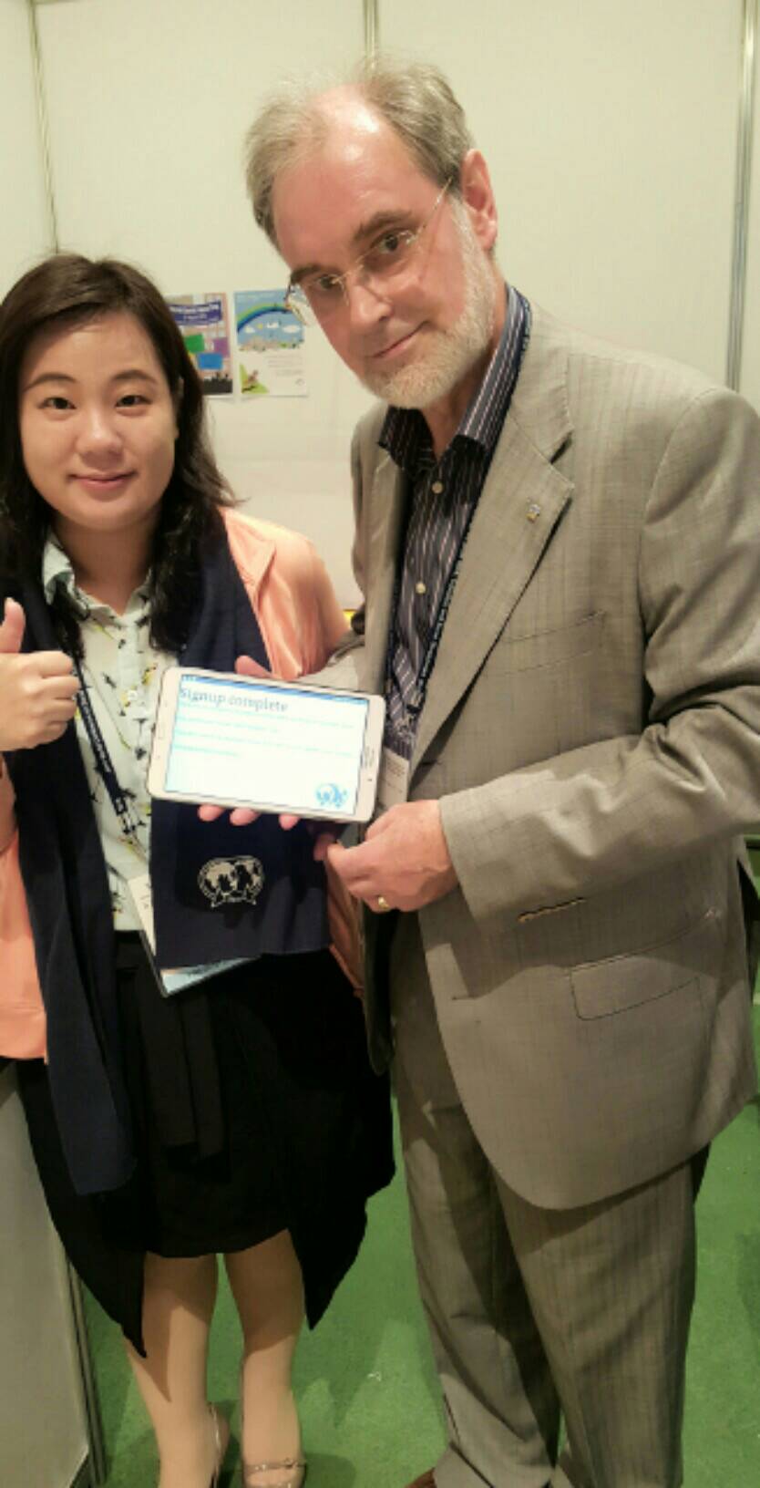 本會戴世玫理事長於今年(105)6月受邀,7月成為《國際社會工作者聯合會》(International Federation of Social Workers, IFSW)的個人終身會員,日後將以台灣國籍的會員身份,參與國際社會工作專業發展事務。戴理事長表示很高興能收到這個來自國際社會的禮物,這是一份榮耀、一份責任,也是一份鼓勵,希望未來在共同推動國際社會工作專業國際交流上持續合作前進。圖為戴理事長與IFSW主席David N. Jones博士在韓國首爾2016年IFSW國際年會合影,David以平板展示完成會籍登錄畫面,並致贈IFSW LOGO圍巾給戴理事長,感謝她對於國際社會工作的投入與支持,恭賀她受邀成為IFSW終身會員。